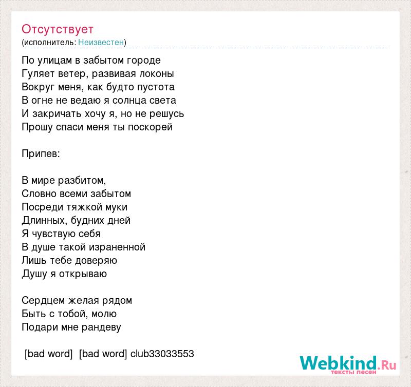 По улицам в забытом городе Гуляет ветер, развивая локоны Вокруг меня, как будто пустота В огне не ведаю я солнца света И закричать хочу я, но не решусь Прошу спаси меня ты поскорей Припев: В мире разбитом, Словно всеми забытом Посреди тяжкой муки Длинных, будних дней Я чувствую себя В душе такой израненной Лишь тебе доверяю Душу я открываю Сердцем желая рядом Быть с тобой, молю Подари мне рандеву [bad word] [bad word] club33033553