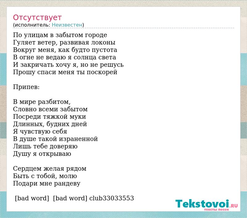 По улицам в забытом городе Гуляет ветер, развивая локоны Вокруг меня, как будто пустота В огне не ведаю я солнца света И закричать хочу я, но не решусь Прошу спаси меня ты поскорей Припев: В мире разбитом, Словно всеми забытом Посреди тяжкой муки Длинных, будних дней Я чувствую себя В душе такой израненной Лишь тебе доверяю Душу я открываю Сердцем желая рядом Быть с тобой, молю Подари мне рандеву [bad word] [bad word] club33033553