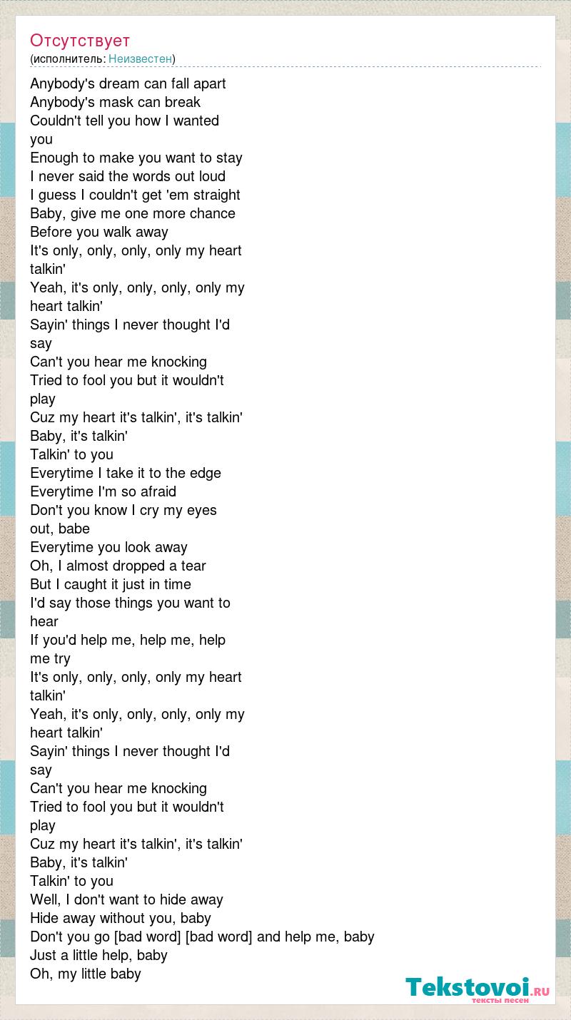 Anybody's dream can fall apart Anybody's mask can break Couldn't tell you how I wanted you Enough to make you want to stay I never said the words out loud I guess I couldn't get 'em straight Baby, give me one more chance Before you walk away It's only, only, only, only my heart talkin' Yeah, it's only, only, only, only my heart talkin' Sayin' things I never thought I'd say Can't you hear me knocking Tried to fool you but it wouldn't play Cuz my heart it's talkin', it's talkin' Baby, it's talkin' Talkin' to you Everytime I take it to the edge Everytime I'm so afraid Don't you know I cry my eyes out, babe Everytime you look away Oh, I almost dropped a tear But I caught it just in time I'd say those things you want to hear If you'd help me, help me, help me try It's only, only, only, only my heart talkin' Yeah, it's only, only, only, only my heart talkin' Sayin' things I never thought I'd say Can't you hear me knocking Tried to fool you but it wouldn't play Cuz my heart it's talkin', it's talkin' Baby, it's talkin' Talkin' to you Well, I don't want to hide away Hide away without you, baby Don't you go [bad word] [bad word] and help me, baby Just a little help, baby Oh, my little baby