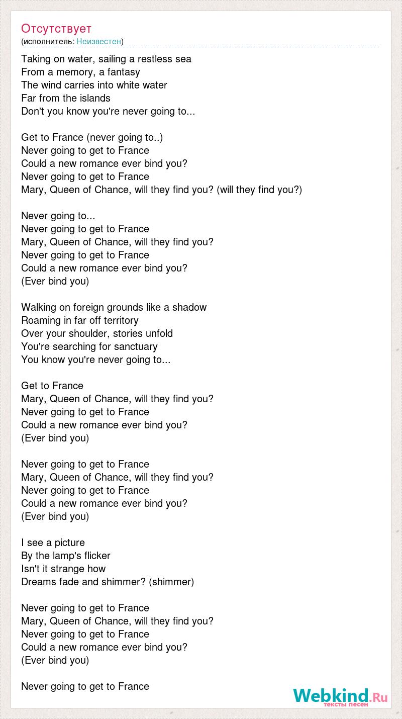 Taking on water, sailing a restless sea From a memory, a fantasy The wind carries into white water Far from the islands Don't you know you're never going to... Get to France (never going to..) Never going to get to France Could a new romance ever bind you? Never going to get to France Mary, Queen of Chance, will they find you? (will they find you?) Never going to... Never going to get to France Mary, Queen of Chance, will they find you? Never going to get to France Could a new romance ever bind you? (Ever bind you) Walking on foreign grounds like a shadow Roaming in far off territory Over your shoulder, stories unfold You're searching for sanctuary You know you're never going to... Get to France Mary, Queen of Chance, will they find you? Never going to get to France Could a new romance ever bind you? (Ever bind you) Never going to get to France Mary, Queen of Chance, will they find you? Never going to get to France Could a new romance ever bind you? (Ever bind you) I see a picture By the lamp's flicker Isn't it strange how Dreams fade and shimmer? (shimmer) Never going to get to France Mary, Queen of Chance, will they find you? Never going to get to France Could a new romance ever bind you? (Ever bind you) Never going to get to France