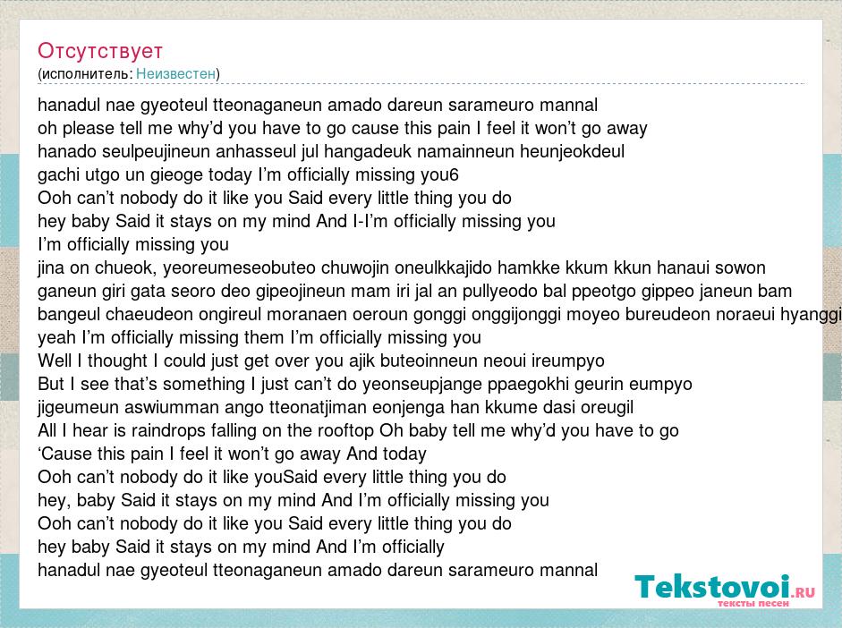 hanadul nae gyeoteul tteonaganeun amado dareun sarameuro mannal oh please tell me why’d you have to go cause this pain I feel it won’t go away hanado seulpeujineun anhasseul jul hangadeuk namainneun heunjeokdeul gachi utgo un gieoge today I’m officially missing you6 Ooh can’t nobody do it like you Said every little thing you do hey baby Said it stays on my mind And I-I’m officially missing you I’m officially missing you jina on chueok, yeoreumeseobuteo chuwojin oneulkkajido hamkke kkum kkun hanaui sowon ganeun giri gata seoro deo gipeojineun mam iri jal an pullyeodo bal ppeotgo gippeo janeun bam bangeul chaeudeon ongireul moranaen oeroun gonggi onggijonggi moyeo bureudeon noraeui hyanggi yeah I’m officially missing them I’m officially missing you Well I thought I could just get over you ajik buteoinneun neoui ireumpyo But I see that’s something I just can’t do yeonseupjange ppaegokhi geurin eumpyo jigeumeun aswiumman ango tteonatjiman eonjenga han kkume dasi oreugil All I hear is raindrops falling on the rooftop Oh baby tell me why’d you have to go ‘Cause this pain I feel it won’t go away And today Ooh can’t nobody do it like youSaid every little thing you do hey, baby Said it stays on my mind And I’m officially missing you Ooh can’t nobody do it like you Said every little thing you do hey baby Said it stays on my mind And I’m officially hanadul nae gyeoteul tteonaganeun amado dareun sarameuro mannal