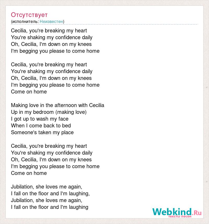 Cecilia, you're breaking my heart You're shaking my confidence daily Oh, Cecilia, I'm down on my knees I'm begging you please [bad word] home Cecilia, you're breaking my heart You're shaking my confidence daily Oh, Cecilia, I'm down on my knees I'm begging you please [bad word] home [bad word] on home Making love in the afternoon with Cecilia Up in my bedroom (making love) I got up to wash my face When [bad word] back to bed Someone's taken my place Cecilia, you're breaking my heart You're shaking my confidence daily Oh, Cecilia, I'm down on my knees I'm begging you please [bad word] home [bad word] on home Jubilation, she loves me again, I fall on the floor and I'm laughing, Jubilation, she loves me again, I fall on the floor and I'm laughing