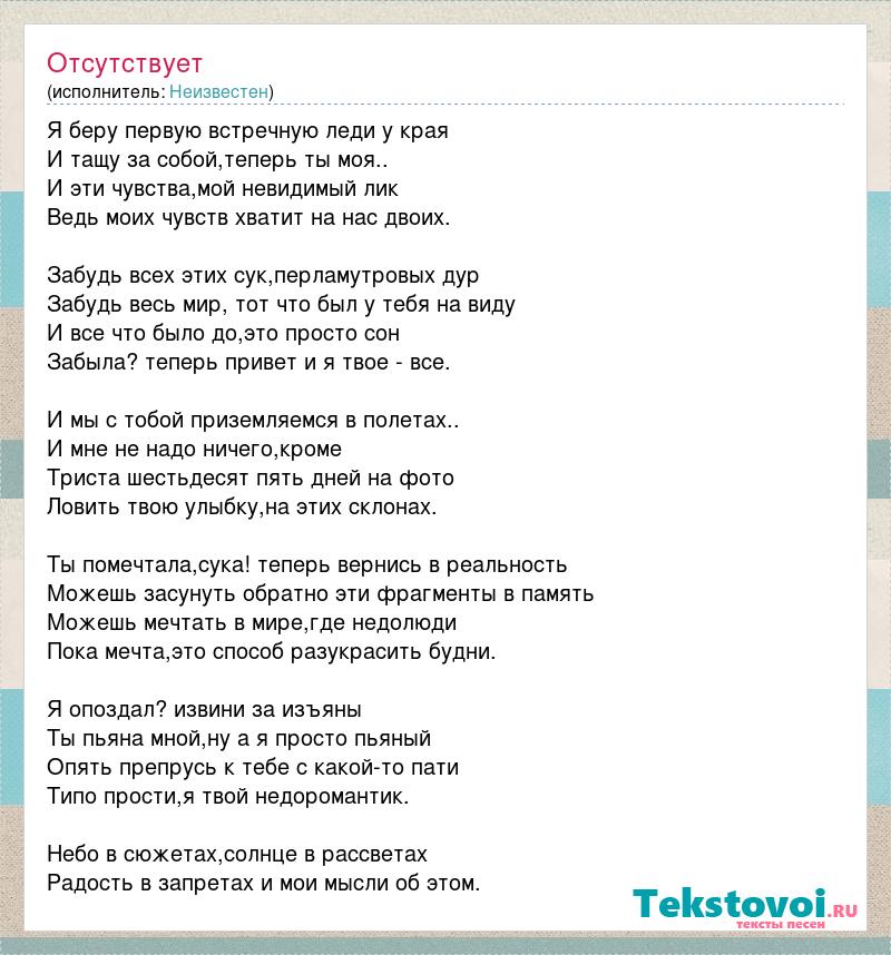 Я беру первую встречную леди у края И тащу за собой,теперь ты моя.. И эти чувства,мой невидимый лик Ведь моих чувств хватит на нас двоих. Забудь всех этих сук,перламутровых дур Забудь весь мир, тот что был у тебя на виду И все что было до,это просто сон Забыла? теперь привет и я твое - все. И мы с тобой приземляемся в полетах.. И мне не надо ничего,кроме Триста шестьдесят пять дней на фото Ловить твою улыбку,на этих склонах. Ты помечтала,сука! теперь вернись в реальность Можешь засунуть обратно эти фрагменты в память Можешь мечтать в мире,где недолюди Пока мечта,это способ разукрасить будни. Я опоздал? извини за изъяны Ты пьяна мной,ну а я просто пьяный Опять препрусь к тебе с какой-то пати Типо прости,я твой недоромантик. Небо в сюжетах,солнце в рассветах Радость в запретах и мои мысли об этом.