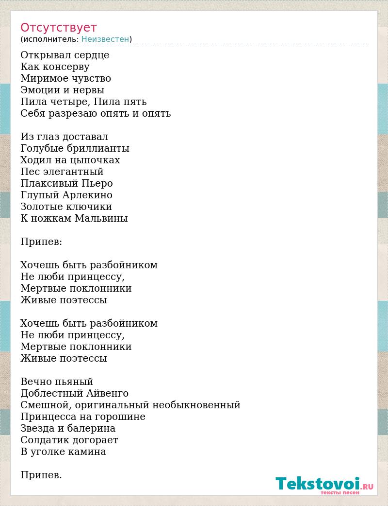 Открывал сердце Как консерву Миримое чувство Эмоции и нервы Пила четыре, Пила пять Себя разрезаю опять и опять Из глаз доставал Голубые бриллианты Ходил на цыпочках Пес элегантный Плаксивый Пьеро Глупый Арлекино Золотые ключики К ножкам Мальвины Припев: Хочешь быть разбойником Не люби принцессу, Мертвые поклонники Живые поэтессы Хочешь быть разбойником Не люби принцессу, Мертвые поклонники Живые поэтессы Вечно пьяный Доблестный Айвенго Смешной, оригинальный необыкновенный Принцесса на горошине Звезда и балерина Солдатик догорает В уголке камина Припев.