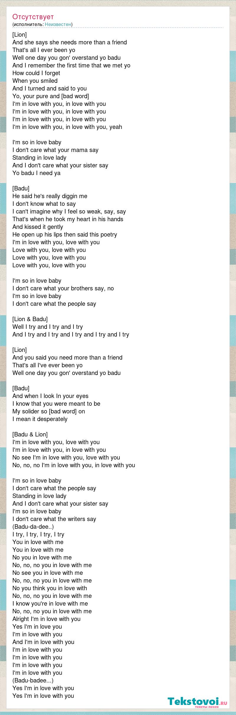[Lion] And she says she needs more than a friend That's all I ever been yo Well one day you gon' overstand yo badu And I remember the first time that we met yo How could I forget When you smiled And I turned and said to you Yo, your pure and [bad word] I'm in love with you, in love with you I'm in love with you, in love with you I'm in love with you, in love with you I'm in love with you, in love with you, yeah I'm so in love baby I don't care what your mama say Standing in love lady And I don't care what your sister say Yo badu I need ya [Badu] He said he's really diggin me I don't know what to say I can't imagine why I feel so weak, say, say That's when he took my heart in his hands And kissed it gently He open up his lips then said this poetry I'm in love with you, love with you Love with you, love with you Love with you, love with you Love with you, love with you I'm so in love baby I don't care what your brothers say, no I'm so in love baby I don't care what the people say [Lion & Badu] Well I try and I try and I try And I try and I try and I try and I try and I try [Lion] And you said you need more than a friend That's all I've ever been yo Well one day you gon' overstand yo badu [Badu] And when I look In your eyes I know that you were meant to be My solider so [bad word] on I mean it desperately [Badu & Lion] I'm in love with you, love with you I'm in love with you, in love with you No see I'm in love with you, love with you No, no, no I'm in love with you, in love with you I'm so in love baby I don't care what the people say Standing in love lady And I don't care what your sister say I'm so in love baby I don't care what the writers say (Badu-da-dee..) I try, I try, I try, I try You in love with me You in love with me No you in love with me No, no, no you in love with me No see you in love with me No, no, no you in love with me No you think you in love with No, no, no you in love with me I know you're in love with me No, no, no you in love with me Alright I'm in love with you Yes I'm in love you I'm in love with you And I'm in love with you I'm in love with you I'm in love with you I'm in love with you I'm in love with you (Badu-badee...) Yes I'm in love with you Yes I'm in love with you