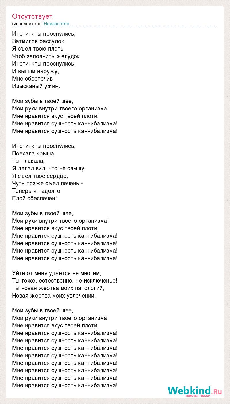 Инстинкты проснулись, Затмился рассудок. Я съел твою плоть Чтоб заполнить желудок Инстинкты проснулись И вышли наружу, Мне обеспечив Изысканый ужин. Мои зубы в твоей шее, Мои руки внутри твоего организма! Мне нравится вкус твоей плоти, Мне нравится сущность каннибализма! Мне нравится сущность каннибализма! Инстинкты проснулись, Поехала крыша. Ты плакала, Я делал вид, что не слышу. Я съел твоё сердце, Чуть позже съел печень - Теперь я надолго Едой обеспечен! Мои зубы в твоей шее, Мои руки внутри твоего организма! Мне нравится вкус твоей плоти, Мне нравится сущность каннибализма! Мне нравится сущность каннибализма! Мне нравится сущность каннибализма! Мне нравится сущность каннибализма! Уйти от меня удаётся не многим, Ты тоже, естественно, не исключенье! Ты новая жертва моих патологий, Новая жертва моих увлечений. Мои зубы в твоей шее, Мои руки внутри твоего организма! Мне нравится вкус твоей плоти, Мне нравится сущность каннибализма! Мне нравится сущность каннибализма! Мне нравится сущность каннибализма! Мне нравится сущность каннибализма! Мне нравится сущность каннибализма! Мне нравится сущность каннибализма! Мне нравится сущность каннибализма! Мне нравится сущность каннибализма!