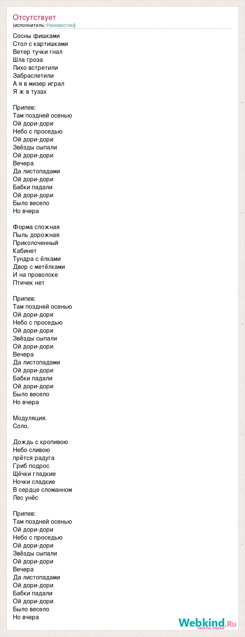 Сосны фишками Стол с картишками Ветер тучки гнал Шла гроза Лихо встретили Забраслетили А я в мизер играл Я ж в тузах Припев: Там поздней осенью Ой дори-дори Небо с проседью Ой дори-дори Звёзды сыпали Ой дори-дори Вечера Да листопадами Ой дори-дори Бабки падали Ой дори-дори Было весело Но вчера Форма сложная Пыль дорожная Приколоченный Кабинет Тундра с ёлками Двор с метёлками И на проволоке Птичек нет Припев: Там поздней осенью Ой дори-дори Небо с проседью Ой дори-дори Звёзды сыпали Ой дори-дори Вечера Да листопадами Ой дори-дори Бабки падали Ой дори-дори Было весело Но вчера Модуляция. Соло. Дождь с кропивою Небо сливою прётся радуга Гриб подрос Щёчки гладкие Ночки сладкие В сердце сломанном Лес унёс Припев: Там поздней осенью Ой дори-дори Небо с проседью Ой дори-дори Звёзды сыпали Ой дори-дори Вечера Да листопадами Ой дори-дори Бабки падали Ой дори-дори Было весело Но вчера