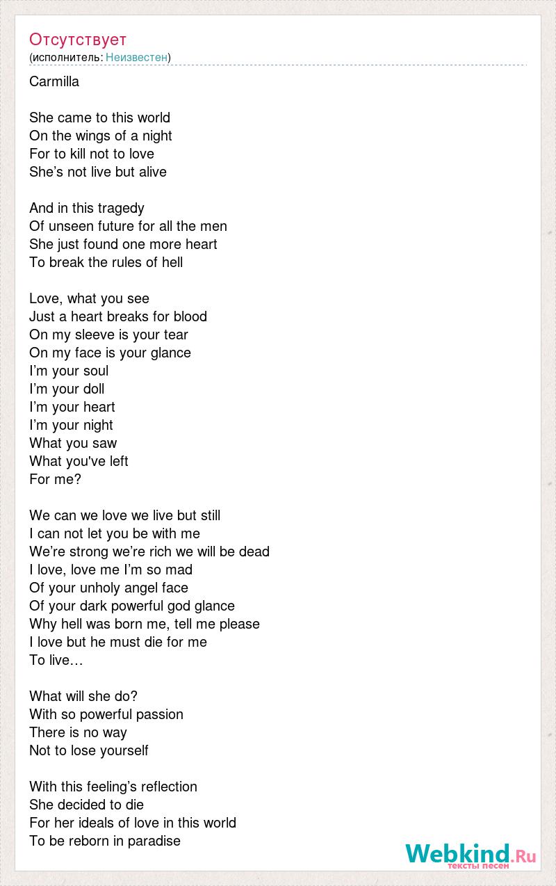 Carmilla She came to this world On the wings of a night For to kill not to love She’s not live but alive And in this tragedy Of unseen future for all the men She just found one more heart To break [bad word] of [bad word] Love, what you see Just a heart breaks for blood On my sleeve is your tear On my face is your glance I’m your soul I’m your doll I’m your heart I’m your night What you saw What you've left For me? We can we love we live but still I can not let you be with me We’re strong we’re rich we will be dead I love, love me I’m so mad Of your unholy angel face Of your dark powerful god glance Why [bad word] was born me, tell me please I love but he must die for me To live… What will she do? With so powerful passion There is no way Not to lose yourself With this feeling’s reflection She decided to die For her ideals of love in this world To be reborn in paradise