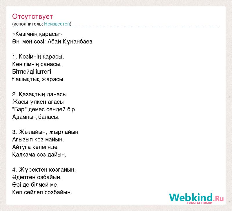 «Көзімнің қарасы» Әні мен сөзі: Абай Құнанбаев 1. Көзімнің қарасы, Көңілімнің санасы, Бітпейді іштегі Ғашықтық жарасы. 2. Қазақтың данасы Жасы үлкен ағасы "Бар" демес сендей бір Адамның баласы. 3. Жылайын, жырлайын Ағызып көз майын. Айтуға келегнде Қалқама сөз дайын. 4. Жүректен козғайын, Әдептен озбайын, Өзі де білмей ме Көп сөйлеп созбайын.