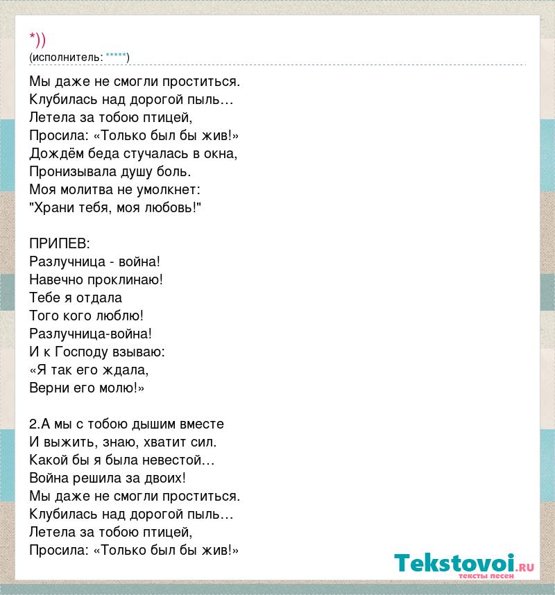 Мы даже не смогли проститься. Клубилась над дорогой пыль… Летела за тобою птицей, Просила: «Только был бы жив!» Дождём беда стучалась в окна, Пронизывала душу боль. Моя молитва не умолкнет: "Храни тебя, моя любовь!" ПРИПЕВ: Разлучница - война! Навечно проклинаю! Тебе я отдала Того кого люблю! Разлучница-война! И к Господу взываю: «Я так его ждала, Верни его молю!» 2.А мы с тобою дышим вместе И выжить, знаю, хватит сил. Какой бы я была невестой… Война решила за двоих! Мы даже не смогли проститься. Клубилась над дорогой пыль… Летела за тобою птицей, Просила: «Только был бы жив!»