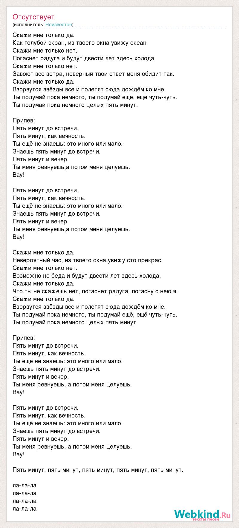 Скажи мне только да. Как голубой экран, из твоего окна увижу океан Скажи мне только нет. Погаснет радуга и будут двести лет здесь холода Скажи мне только нет. Завоют все ветра, неверный твой ответ меня обидит так. Скажи мне только да. Взорвутся звёзды все и полетят сюда дождём ко мне. Ты подумай пока немного, ты подумай ещё, ещё чуть-чуть. Ты подумай пока немного целых пять минут. Припев: Пять минут до встречи. Пять минут, как вечность. Ты ещё не знаешь: это много или мало. Знаешь пять минут до встречи. Пять минут и вечер. Ты меня ревнуешь,а потом меня целуешь. Вау! Пять минут до встречи. Пять минут, как вечность. Ты ещё не знаешь: это много или мало. Знаешь пять минут до встречи. Пять минут и вечер. Ты меня ревнуешь,а потом меня целуешь. Вау! Скажи мне только да. Невероятный час, из твоего окна увижу сто прекрас. Скажи мне только нет. Возможно не беда и будут двести лет здесь холода. Скажи мне только да. Что ты не скажешь нет, погаснет радуга, погасну с нею я. Скажи мне только да. Взорвутся звёзды все и полетят сюда дождём ко мне. Ты подумай пока немного, ты подумай ещё, ещё чуть-чуть. Ты подумай пока немного целых пять минут. Припев: Пять минут до встречи. Пять минут, как вечность. Ты ещё не знаешь: это много или мало. Знаешь пять минут до встречи. Пять минут и вечер. Ты меня ревнуешь, а потом меня целуешь. Вау! Пять минут до встречи. Пять минут, как вечность. Ты ещё не знаешь: это много или мало. Знаешь пять минут до встречи. Пять минут и вечер. Ты меня ревнуешь, а потом меня целуешь. Вау! Пять минут, пять минут, пять минут, пять минут, пять минут. ла-ла-ла ла-ла-ла ла-ла-ла ла-ла-ла