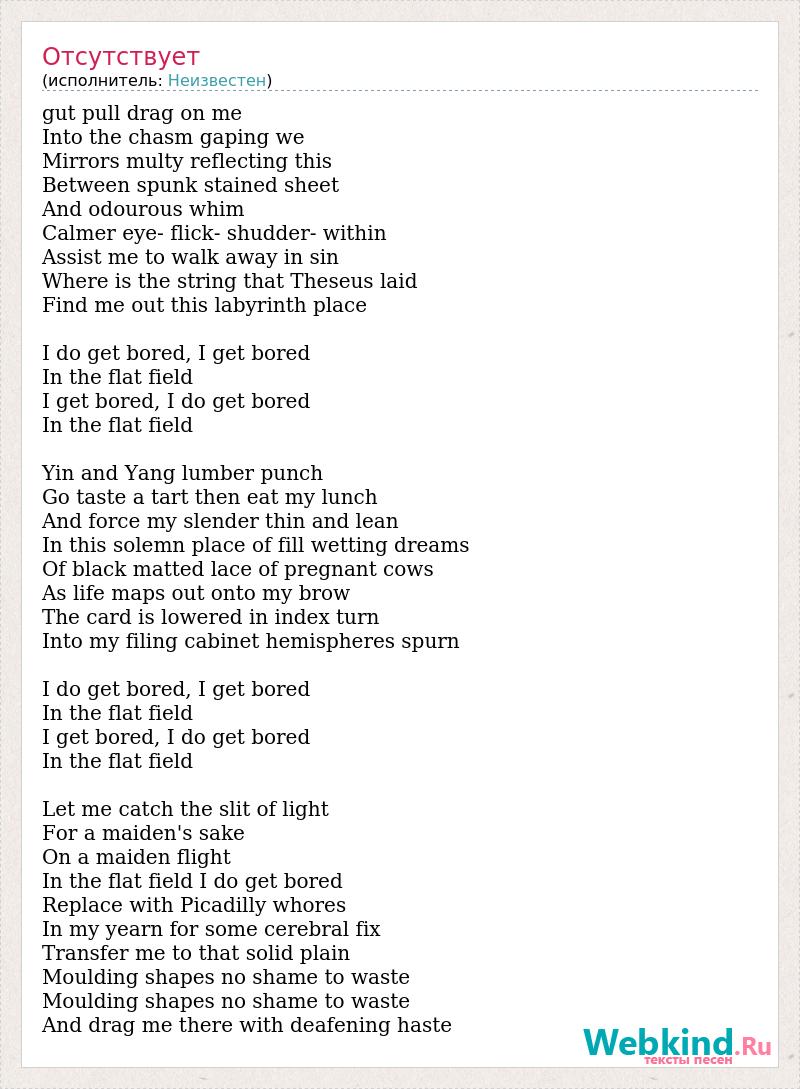 gut pull drag on me Into the chasm gaping we Mirrors multy reflecting this Between spunk stained sheet And odourous whim Calmer eye- flick- shudder- within Assist me to walk away in sin Where is the string that Theseus laid Find me out this labyrinth place I do get bored, I get bored In the flat field I get bored, I do get bored In the flat field Yin and Yang lumber punch Go taste a tart then eat my lunch And force my slender thin and lean In this solemn place of fill wetting dreams Of black matted lace of pregnant cows As life maps out onto my brow The card is lowered in index turn Into my filing cabinet hemispheres spurn I do get bored, I get bored In the flat field I get bored, I do get bored In the flat field Let me catch the slit of light For a maiden's sake On a maiden flight In the flat field I do get bored Replace with Picadilly whores In my yearn for some cerebral fix Transfer me to that solid plain Moulding shapes no shame to waste Moulding shapes no shame to waste And drag me there with deafening haste