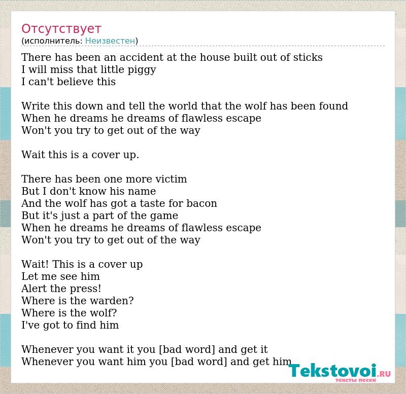 There has been an accident at the house built out of sticks I will miss that little piggy I can't believe this Write this down and tell the world that the wolf has been found When he dreams he dreams of flawless escape Won't you try to get out of the way Wait this is a cover up. There has been one more victim But I don't know his name And the wolf has got a taste for bacon But it's just a part of the game When he dreams he dreams of flawless escape Won't you try to get out of the way Wait! This is a cover up Let me see him Alert the press! Where is the warden? Where is the wolf? I've got to find him Whenever you want it you [bad word] and get it Whenever you want him you [bad word] and get him