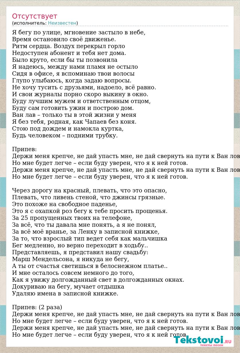 Я бегу по улице, мгновение застыло в небе, Время остановило своё движенье. Ритм сердца. Воздух перекрыл горло Недоступен абонент и тебя нет дома. Было круто, если бы ты позвонила Я надеюсь, между нами пламя не остыло Сидя в офисе, я вспоминаю твои волосы Глупо улыбаюсь, когда задаю вопросы. Не хочу тусить с друзьями, надоело, всё равно. И свои журналы порно скоро выкину в окно. Буду лучшим мужем и ответственным отцом, Буду сам готовить ужин и построю дом. Ван лав – только ты в этой жизни у меня Я без тебя, родная, как Чапаев без коня. Стою под дождем и намокла куртка, Будь человеком – подними трубку. Припев: Держи меня крепче, не дай упасть мне, не дай свернуть на пути к Ван лов Но мне будет легче – если буду уверен, что я к ней готов. Держи меня крепче, не дай упасть мне, не дай свернуть на пути к Ван лов Но мне будет легче – если буду уверен, что я к ней готов. Через дорогу на красный, плевать, что это опасно, Плевать, что ливень стеной, что джинсы грязные. Это похоже на свободное паденье, Это я с охапкой роз бегу к тебе просить прощенья. За 25 пропущенных твоих на телефоне, За всё, что ты давала мне понять, а я не понял, За всё моё вранье, за Ленку в записной книжке, За то, что взрослый тип ведет себя как мальчишка Бег медленно, но верно переходит в ходьбу.. Представляешь, я представил нашу свадьбу: Марш Мендельсона, я никуда не бегу, А ты от счастья светишься в белоснежном платье.. И мне осталось совсем немного до того, Как я увижу долгожданный свет в долгожданных окнах. Докуриваю на бегу, мучает отдышка Удаляю имена в записной книжке. Припев: (2 раза) Держи меня крепче, не дай упасть мне, не дай свернуть на пути к Ван лов Но мне будет легче – если буду уверен, что я к ней готов. Держи меня крепче, не дай упасть мне, не дай свернуть на пути к Ван лов Но мне будет легче – если буду уверен, что я к ней готов.