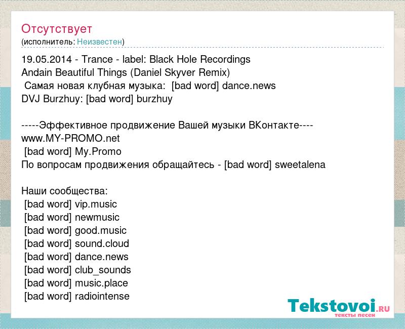19.05.2014 - Trance - label: Black Hole Recordings Andain Beautiful Things (Daniel Skyver Remix) Самая новая клубная музыка: [bad word] dance.news DVJ Burzhuy: [bad word] burzhuy -----Эффективное продвижение Вашей музыки ВКонтакте---- www.MY-PROMO.net [bad word] My.Promo По вопросам продвижения oбращайтесь - [bad word] sweetalena Наши сообщества: [bad word] vip.music [bad word] newmusic [bad word] good.music [bad word] sound.cloud [bad word] dance.news [bad word] club_sounds [bad word] music.place [bad word] radiointense