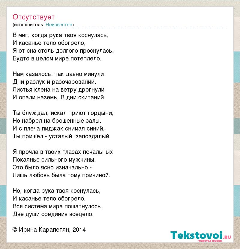 В миг, когда рука твоя коснулась, И касанье тело обогрело, Я от сна столь долгого проснулась, Будто в целом мире потеплело. Нам казалось: так давно минули Дни разлук и разочарований. Листья клена на ветру дрогнули И опали наземь. В дни скитаний Ты блуждал, искал приют гордыни, Но набрел на брошенные залы. И с плеча пиджак снимая синий, Ты пришел - усталый, запоздалый. Я прочла в твоих глазах печальных Покаянье сильного мужчины. Это было ясно изначально - Лишь любовь была тому причиной. Но, когда рука твоя коснулась, И касанье тело обогрело. Вся система мира пошатнулось, Две души соединив всецело. © Ирина Карапетян, 2014