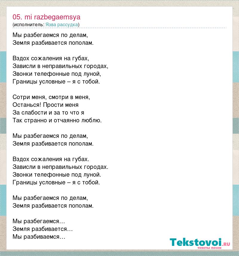 Мы разбегаемся по делам, Земля разбивается пополам. Вздох сожаления на губах, Зависли в неправильных городах, Звонки телефонные под луной, Границы условные – я с тобой. Сотри меня, смотри в меня, Останься! Прости меня За слабости и за то что я Так странно и отчаянно люблю. Мы разбегаемся по делам, Земля разбивается пополам. Вздох сожаления на губах. Зависли в неправильных городах. Звонки телефонные под луной. Границы условные – я с тобой. Мы разбегаемся по делам, Земля разбивается пополам. Мы разбегаемся… Земля разбивается… Мы разбиваемся…