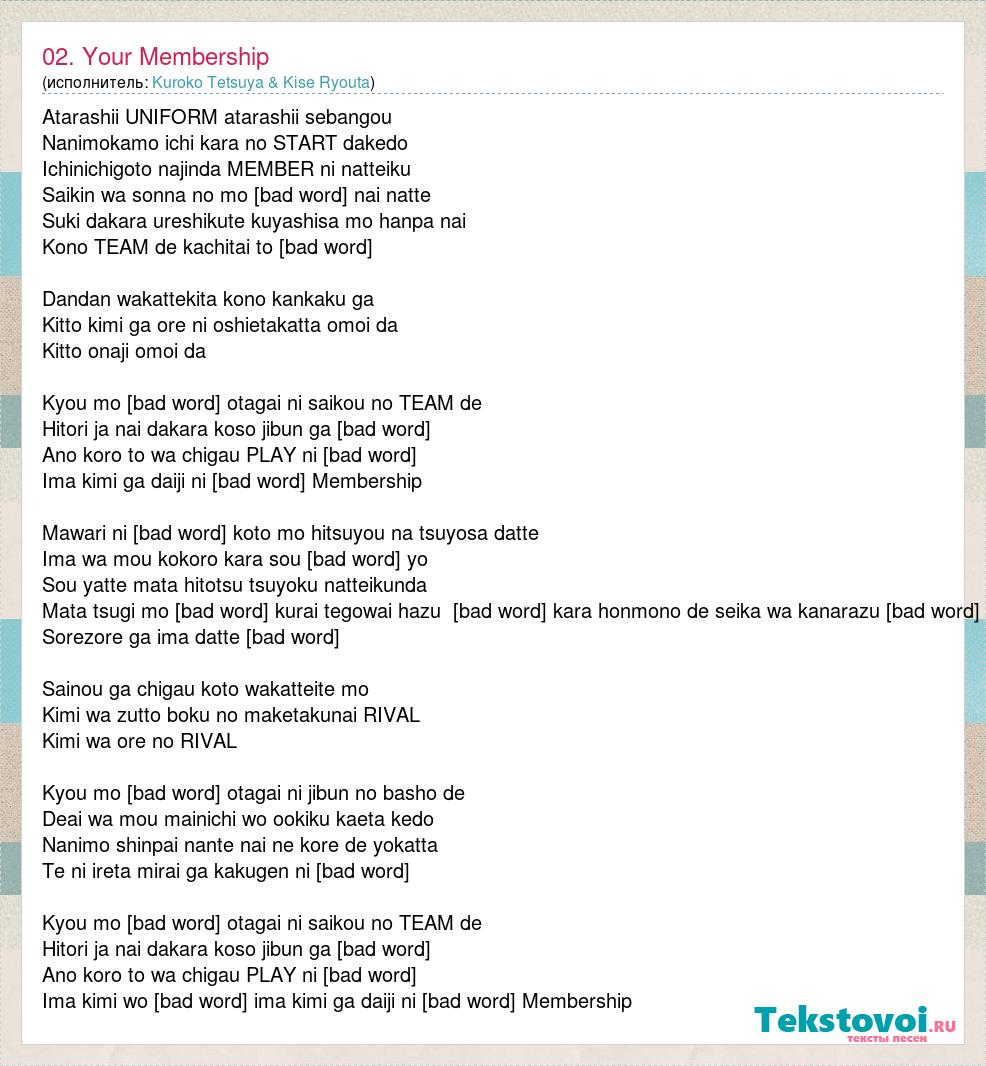 Atarashii UNIFORM atarashii sebangou Nanimokamo ichi kara no START dakedo Ichinichigoto najinda MEMBER ni natteiku Saikin wa sonna no mo [bad word] nai natte Suki dakara ureshikute kuyashisa mo hanpa nai Kono TEAM de kachitai to [bad word] Dandan wakattekita kono kankaku ga Kitto kimi ga ore ni oshietakatta omoi da Kitto onaji omoi da Kyou mo [bad word] otagai ni saikou no TEAM de Hitori ja nai dakara koso jibun ga [bad word] Ano koro to wa chigau PLAY ni [bad word] Ima kimi ga daiji ni [bad word] Membership Mawari ni [bad word] koto mo hitsuyou na tsuyosa datte Ima wa mou kokoro kara sou [bad word] yo Sou yatte mata hitotsu tsuyoku natteikunda Mata tsugi mo [bad word] kurai tegowai hazu [bad word] kara honmono de seika wa kanarazu [bad word] Sorezore ga ima datte [bad word] Sainou ga chigau koto wakatteite mo Kimi wa zutto boku no maketakunai RIVAL Kimi wa ore no RIVAL Kyou mo [bad word] otagai ni jibun no basho de Deai wa mou mainichi wo ookiku kaeta kedo Nanimo shinpai nante nai ne kore de yokatta Te ni ireta mirai ga kakugen ni [bad word] Kyou mo [bad word] otagai ni saikou no TEAM de Hitori ja nai dakara koso jibun ga [bad word] Ano koro to wa chigau PLAY ni [bad word] Ima kimi wo [bad word] ima kimi ga daiji ni [bad word] Membership