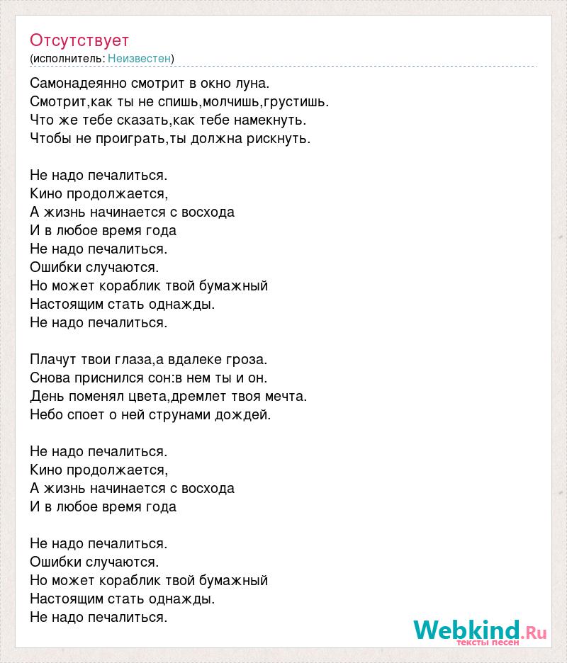 Самонадеянно смотрит в окно луна. Смотрит,как ты не спишь,молчишь,грустишь. Что же тебе сказать,как тебе намекнуть. Чтобы не проиграть,ты должна рискнуть. Не надо печалиться. Кино продолжается, А жизнь начинается с восхода И в любое время года Не надо печалиться. Ошибки случаются. Но может кораблик твой бумажный Настоящим стать однажды. Не надо печалиться. Плачут твои глаза,а вдалеке гроза. Снова приснился сон:в нем ты и он. День поменял цвета,дремлет твоя мечта. Небо споет о ней струнами дождей. Не надо печалиться. Кино продолжается, А жизнь начинается с восхода И в любое время года Не надо печалиться. Ошибки случаются. Но может кораблик твой бумажный Настоящим стать однажды. Не надо печалиться.