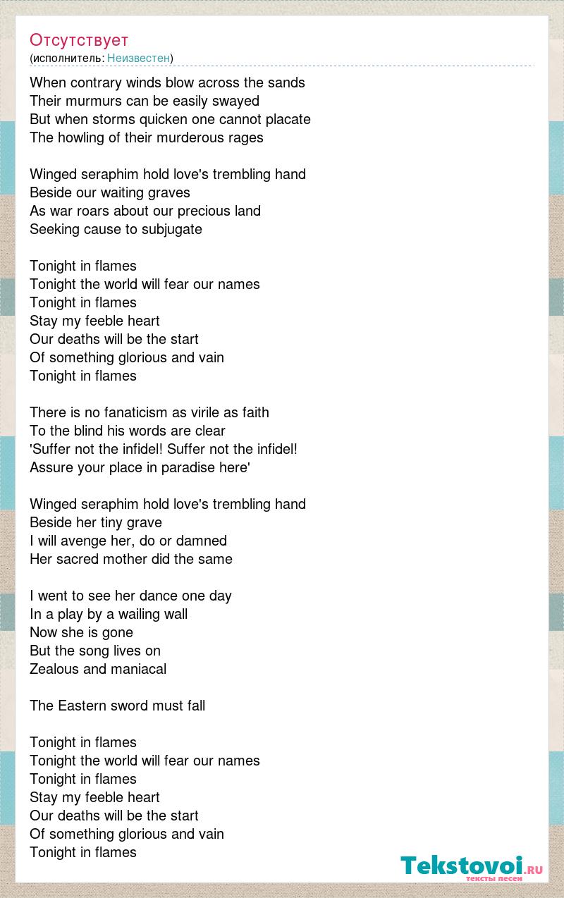 When contrary winds blow across the sands Their murmurs can be easily swayed But when storms quicken one cannot placate The howling of their murderous rages Winged seraphim hold love's trembling hand Beside our waiting graves As war roars about our precious land Seeking cause to subjugate Tonight in flames Tonight the world will fear our names Tonight in flames Stay my feeble heart Our deaths will be the start Of something glorious and vain Tonight in flames There is no fanaticism as virile as faith To the blind his words are clear 'Suffer not the infidel! Suffer not the infidel! Assure your place in paradise here' Winged seraphim hold love's trembling hand Beside her tiny grave I will avenge her, do or damned Her sacred mother did the same I went to see her dance one day In a play by a wailing wall Now she is gone But the song lives on Zealous and maniacal The Eastern sword must fall Tonight in flames Tonight the world will fear our names Tonight in flames Stay my feeble heart Our deaths will be the start Of something glorious and vain Tonight in flames