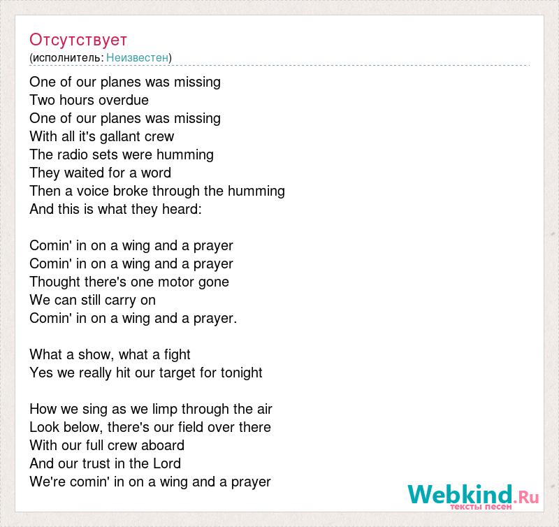 One of our planes was missing Two hours overdue One of our planes was missing With all it's gallant crew The radio sets were humming They waited for a word Then a voice broke through the humming And this is what they heard: [bad word] #39; in on a wing and a prayer [bad word] #39; in on a wing and a prayer Thought there's one motor gone We can still carry on [bad word] #39; in on a wing and a prayer. What a show, what a fight Yes we really hit our target for tonight How we sing as we limp through the air Look below, there's our field over there With our full crew aboard And our [bad word] in the Lord [bad word] #39; in on a wing and a prayer