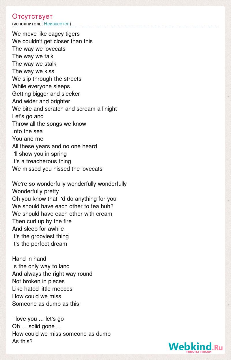 We move like cagey tigers We couldn't get closer than this The way we lovecats The way we talk The way we stalk The way we kiss We slip through the streets While everyone sleeps Getting bigger and sleeker And wider and brighter We bite and scratch and scream all night Let's go and Throw all the songs we know Into the sea You and me All these years and no one heard I'll show you in spring It's a treacherous thing We missed you hissed the lovecats We're so wonderfully wonderfully wonderfully Wonderfully pretty Oh you know that I'd do anything for you We should have each other to tea huh? We should have each other with cream Then curl up by the fire And sleep for awhile It's the grooviest thing It's the perfect dream Hand in hand Is the only way to land And always the right way round Not broken in pieces Like hated little meeces How could we miss Someone as dumb as this I love you ... let's go Oh ... solid gone ... How could we miss someone as dumb As this?