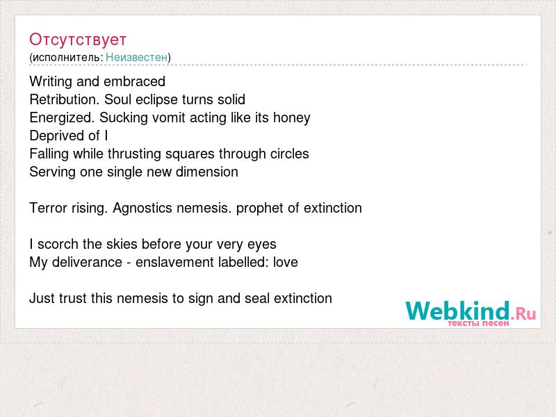 Writing and embraced Retribution. Soul eclipse turns solid Energized. Sucking vomit acting like its honey Deprived of I Falling while [bad word] squares through circles Serving one single new dimension Terror rising. Agnostics nemesis. prophet of extinction I scorch the skies before your very eyes My deliverance - enslavement labelled: love Just [bad word] this nemesis to sign and seal extinction