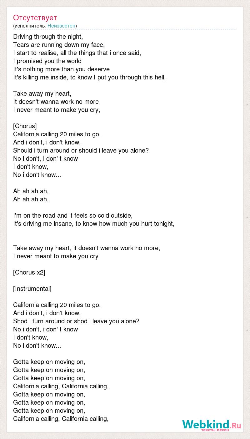 Driving through the night, Tears [bad word] down my face, I start to realise, all the things that i once said, I promised you the world It's nothing more than you deserve It's killing me inside, to know I put you through this [bad word] Take away my heart, It doesn't wanna work no more I never meant to make you cry, [bad word] California calling 20 miles to go, And i don't, i don't know, Should i turn around or should i leave you alone? No i don't, i don' t know I don't know, No i don't know... Ah ah ah ah, Ah ah ah ah, I'm on the road and it feels so cold outside, It's driving me insane, to know how much you hurt tonight, Take away my heart, it doesn't wanna work no more, I never meant to make you cry [bad word] x2] [bad word] California calling 20 miles to go, And i don't, i don't know, Shod i turn around or shod i leave you alone? No i don't, i don' t know I don't know, No i don't know... Gotta keep on moving on, Gotta keep on moving on, Gotta keep on moving on, California calling, California calling, Gotta keep on moving on, Gotta keep on moving on, Gotta keep on moving on, California calling, California calling,