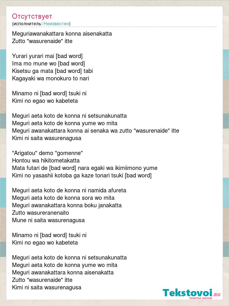 Meguriawanakattara konna aisenakatta Zutto "wasurenaide" itte Yurari yurari mai [bad word] Ima mo mune wo [bad word] Kisetsu ga mata [bad word] tabi Kagayaki wa monokuro to nari Minamo ni [bad word] tsuki ni Kimi no egao wo kabeteta Meguri aeta koto de konna ni setsunakunatta Meguri aeta koto de konna yume wo mita Meguri awanakattara konna ai senaka wa zutto "wasurenaide" itte Kimi ni saita wasurenagusa "Arigatou" demo "gomenne" Hontou wa hikitometakatta Mata futari de [bad word] nara egaki wa ikimiimono yume Kimi no yasashii kotoba ga kaze tonari tsuki [bad word] Meguri aeta koto de konna ni namida afureta Meguri aeta koto de konna sora wo mita Meguri awanakattara konna boku janakatta Zutto wasureranenaito Mune ni saita wasurenagusa Minamo ni [bad word] tsuki ni Kimi no egao wo kabeteta Meguri aeta koto de konna ni setsunakunatta Meguri aeta koto de konna yume wo mita Meguri awanakattara konna aisenakatta Zutto "wasurenaide" itte Kimi ni saita wasurenagusa