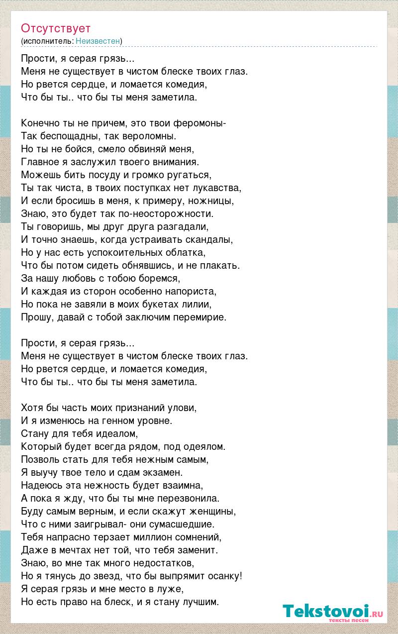 Прости, я серая грязь... Меня не существует в чистом блеске твоих глаз. Но рвется сердце, и ломается комедия, Что бы ты.. что бы ты меня заметила. Конечно ты не причем, это твои феромоны- Так беспощадны, так вероломны. Но ты не бойся, смело обвиняй меня, Главное я заслужил твоего внимания. Можешь бить посуду и громко ругаться, Ты так чиста, в твоих поступках нет лукавства, И если бросишь в меня, к примеру, ножницы, Знаю, это будет так по-неосторожности. Ты говоришь, мы друг друга разгадали, И точно знаешь, когда устраивать скандалы, Но у нас есть успокоительных облатка, Что бы потом сидеть обнявшись, и не плакать. За нашу любовь с тобою боремся, И каждая из сторон особенно напориста, Но пока не завяли в моих букетах лилии, Прошу, давай с тобой заключим перемирие. Прости, я серая грязь... Меня не существует в чистом блеске твоих глаз. Но рвется сердце, и ломается комедия, Что бы ты.. что бы ты меня заметила. Хотя бы часть моих признаний улови, И я изменюсь на генном уровне. Стану для тебя идеалом, Который будет всегда рядом, под одеялом. Позволь стать для тебя нежным самым, Я выучу твое тело и сдам экзамен. Надеюсь эта нежность будет взаимна, А пока я жду, что бы ты мне перезвонила. Буду самым верным, и если скажут женщины, Что с ними заигрывал- они сумасшедшие. Тебя напрасно терзает миллион сомнений, Даже в мечтах нет той, что тебя заменит. Знаю, во мне так много недостатков, Но я тянусь до звезд, что бы выпрямит осанку! Я серая грязь и мне место в луже, Но есть право на блеск, и я стану лучшим.