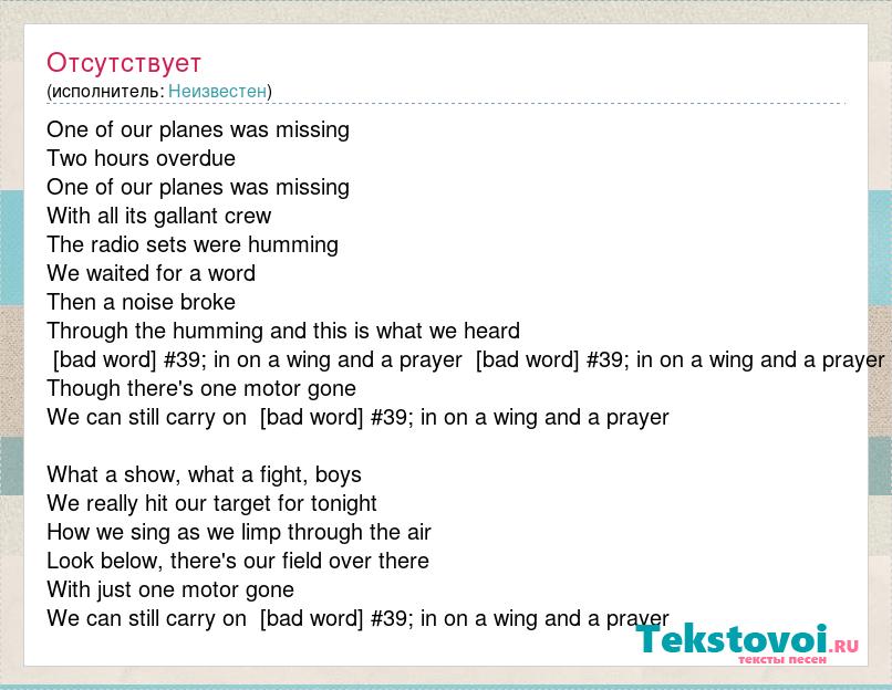 One of our planes was missing Two hours overdue One of our planes was missing With all its gallant crew The radio sets were humming We waited for a word Then a noise broke Through the humming and this is what we heard [bad word] #39; in on a wing and a prayer [bad word] #39; in on a wing and a prayer Though there's one motor gone We can still carry on [bad word] #39; in on a wing and a prayer What a show, what a fight, boys We really hit our target for tonight How we sing as we limp through the air Look below, there's our field over there With just one motor gone We can still carry on [bad word] #39; in on a wing and a prayer