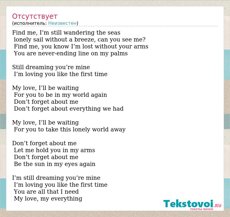 Find me, I’m still wandering the seas lonely sail without a breeze, can you see me? Find me, you know I’m lost without your arms You are never-ending line on my palms Still dreaming you’re mine I’m loving you like the first time My love, I’ll be waiting For you to be in my world again Don’t forget about me Don’t forget about everything we had My love, I’ll be waiting For you to take this lonely world away Don’t forget about me Let me hold you in my arms Don’t forget about me Be the sun in my eyes again I’m still dreaming you’re mine I’m loving you like the first time You are all that I need My love, my everything