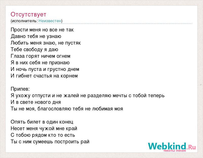 Прости меня но все не так Давно тебя не узнаю Любить меня знаю, не пустяк Тебе свободу я даю Глаза горят ничем огнем Я в них себя не признаю И ночь пуста и грустно днем И гибнет счастья на корнем Припев: Я ухожу отпусти и не жалей не разделяю мечты с тобой теперь И в свете нового дня Ты не моя, благословляю тебя не любимая моя Опять билет в один конец Несет меня чужой мне край С тобою рядом кто то есть Ты с ним сумеешь построить рай