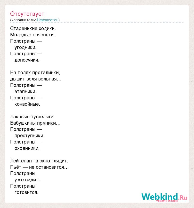 Старенькие ходики. Молодые ноченьки… Полстраны — угодники. Полстраны — доносчики. На полях проталинки, дышит воля вольная… Полстраны — этапники. Полстраны — конвойные. Лаковые туфельки. Бабушкины пряники… Полстраны — преступники. Полстраны — охранники. Лейтенант в окно глядит. Пьёт — не остановится… Полстраны уже сидит. Полстраны готовится.