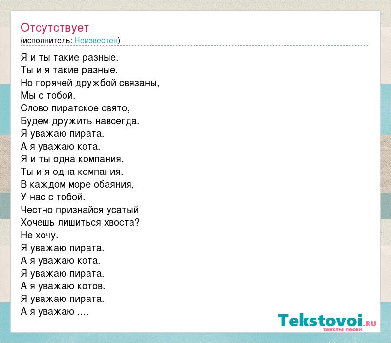 Я и ты такие разные. Ты и я такие разные. Но горячей дружбой связаны, Мы с тобой. Слово пиратское свято, Будем дружить навсегда. Я уважаю пирата. А я уважаю кота. Я и ты одна компания. Ты и я одна компания. В каждом море обаяния, У нас с тобой. Честно признайся усатый Хочешь лишиться хвоста? Не хочу. Я уважаю пирата. А я уважаю кота. Я уважаю пирата. А я уважаю котов. Я уважаю пирата. А я уважаю ....