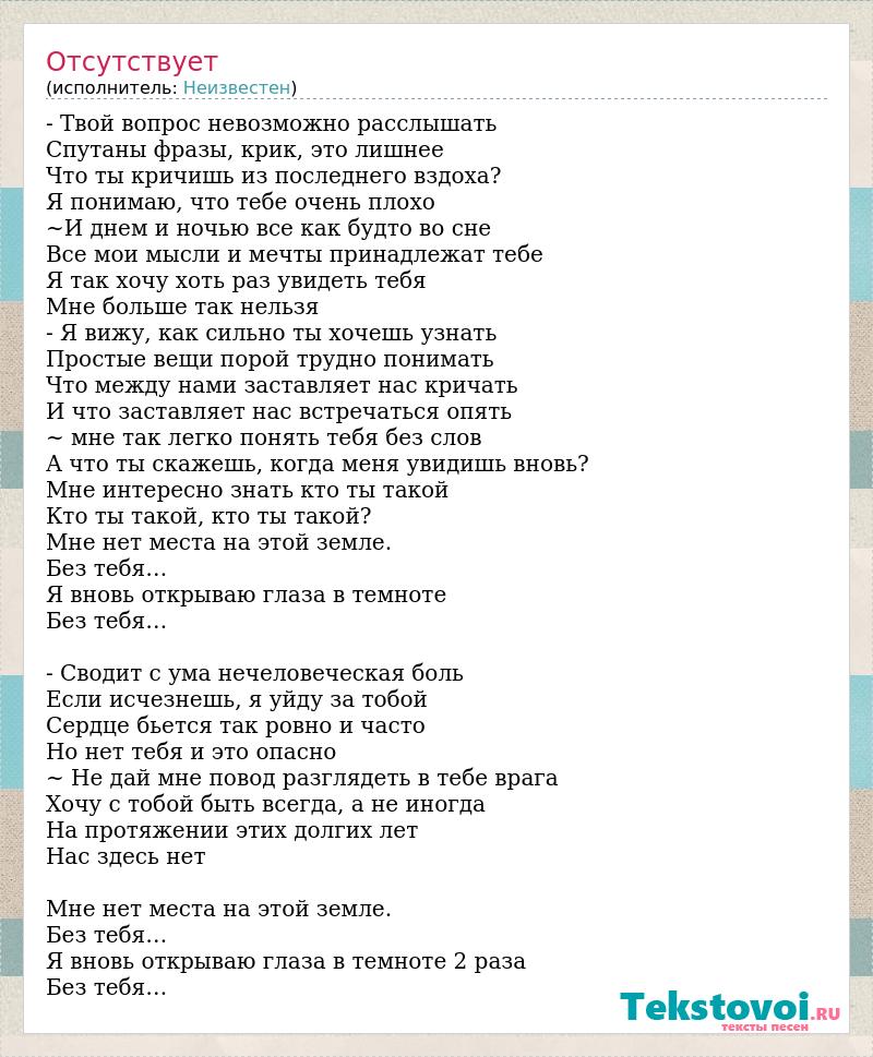 - Твой вопрос невозможно расслышать Спутаны фразы, крик, это лишнее Что ты кричишь из последнего вздоха? Я понимаю, что тебе очень плохо ~И днем и ночью все как будто во сне Все мои мысли и мечты принадлежат тебе Я так хочу хоть раз увидеть тебя Мне больше так нельзя - Я вижу, как сильно ты хочешь узнать Простые вещи порой трудно понимать Что между нами заставляет нас кричать И что заставляет нас встречаться опять ~ мне так легко понять тебя без слов А что ты скажешь, когда меня увидишь вновь? Мне интересно знать кто ты такой Кто ты такой, кто ты такой? Мне нет места на этой земле. Без тебя… Я вновь открываю глаза в темноте Без тебя… - Сводит с ума нечеловеческая боль Если исчезнешь, я уйду за тобой Сердце бьется так ровно и часто Но нет тебя и это опасно ~ Не дай мне повод разглядеть в тебе врага Хочу с тобой быть всегда, а не иногда На протяжении этих долгих лет Нас здесь нет Мне нет места на этой земле. Без тебя… Я вновь открываю глаза в темноте 2 раза Без тебя…