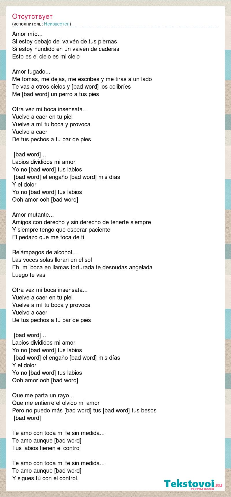 Amor mío... Si estoy debajo del vaivén de tus piernas Si estoy hundido en un vaivén de caderas Esto es el cielo es mi cielo Amor fugado... Me tomas, me dejas, me escribes y me tiras a un lado Te vas a otros cielos y [bad word] los colibríes Me [bad word] un perro a tus pies Otra vez mi boca insensata... Vuelve a caer en tu piel Vuelve a mí tu boca y provoca Vuelvo a caer De tus pechos a tu par de pies [bad word] .. Labios divididos mi amor Yo no [bad word] tus labios [bad word] el engaño [bad word] mis días Y el dolor Yo no [bad word] tus labios Ooh amor ooh [bad word] Amor mutante... Amigos con derecho y sin derecho de tenerte siempre Y siempre tengo que esperar paciente El pedazo que me toca de ti Relámpagos de alcohol... Las voces solas lloran en el sol Eh, mi boca en llamas torturada te desnudas angelada Luego te vas Otra vez mi boca insensata... Vuelve a caer en tu piel Vuelve a mí tu boca y provoca Vuelvo a caer De tus pechos a tu par de pies [bad word] .. Labios divididos mi amor Yo no [bad word] tus labios [bad word] el engaño [bad word] mis días Y el dolor Yo no [bad word] tus labios Ooh amor ooh [bad word] Que me parta un rayo... Que me entierre el olvido mi amor Pero no puedo más [bad word] tus [bad word] tus besos [bad word] Te amo con toda mi fe sin medida... Te amo aunque [bad word] Tus labios tienen el control Te amo con toda mi fe sin medida... Te amo aunque [bad word] Y sigues tú con el control.