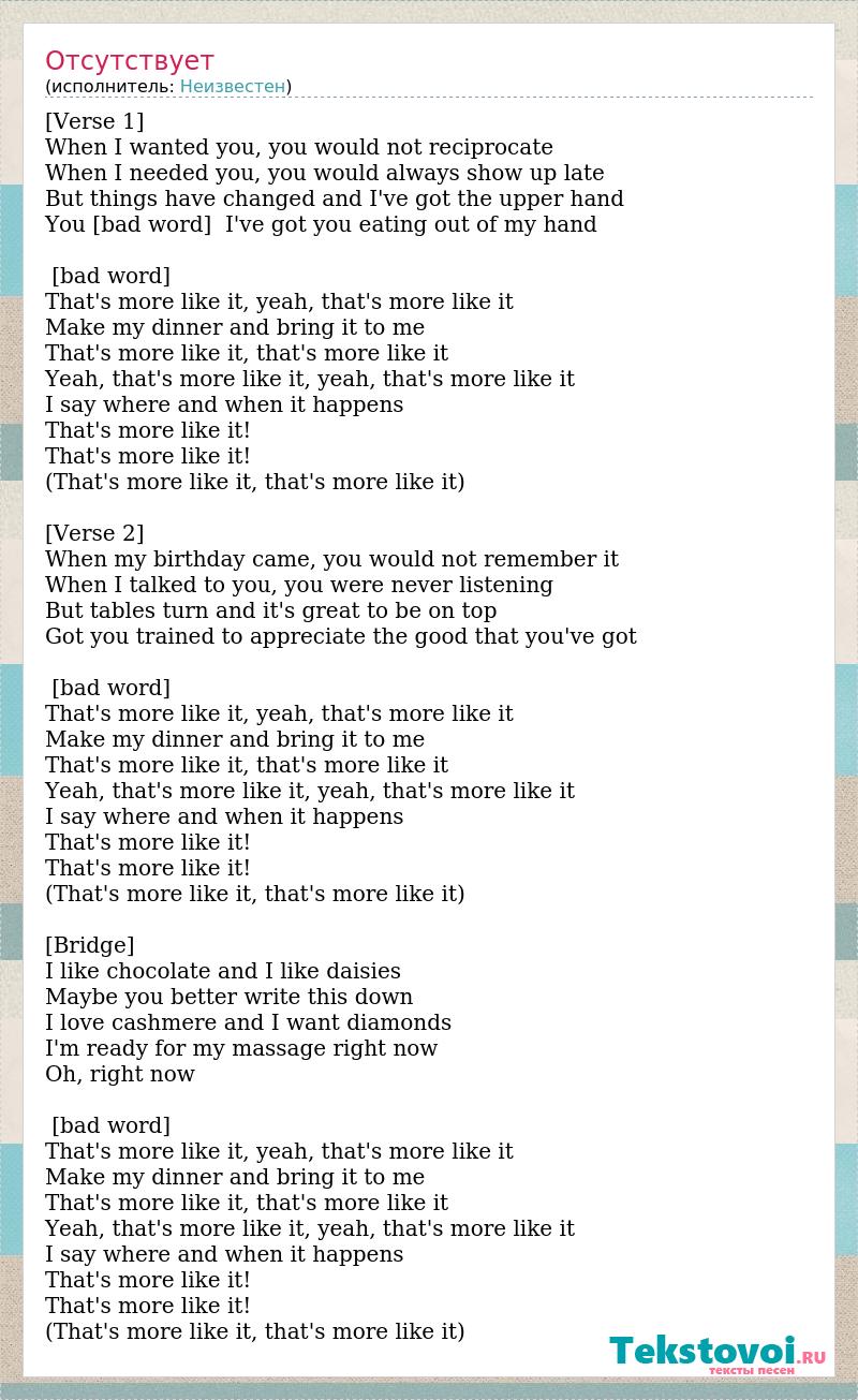 [Verse 1] When I wanted you, you would not reciprocate When I needed you, you would always show up late But things have changed and I've got the upper hand You [bad word] I've got you eating out of my hand [bad word] That's more like it, yeah, that's more like it Make my dinner and bring it to me That's more like it, that's more like it Yeah, that's more like it, yeah, that's more like it I say where and when it happens That's more like it! That's more like it! (That's more like it, that's more like it) [Verse 2] When my birthday came, you would not remember it When I talked to you, you were never listening But tables turn and it's great to be on top Got you trained to appreciate the good that you've got [bad word] That's more like it, yeah, that's more like it Make my dinner and bring it to me That's more like it, that's more like it Yeah, that's more like it, yeah, that's more like it I say where and when it happens That's more like it! That's more like it! (That's more like it, that's more like it) [Bridge] I like chocolate and I like daisies Maybe you better write this down I love cashmere and I want diamonds I'm ready for my massage right now Oh, right now [bad word] That's more like it, yeah, that's more like it Make my dinner and bring it to me That's more like it, that's more like it Yeah, that's more like it, yeah, that's more like it I say where and when it happens That's more like it! That's more like it! (That's more like it, that's more like it)