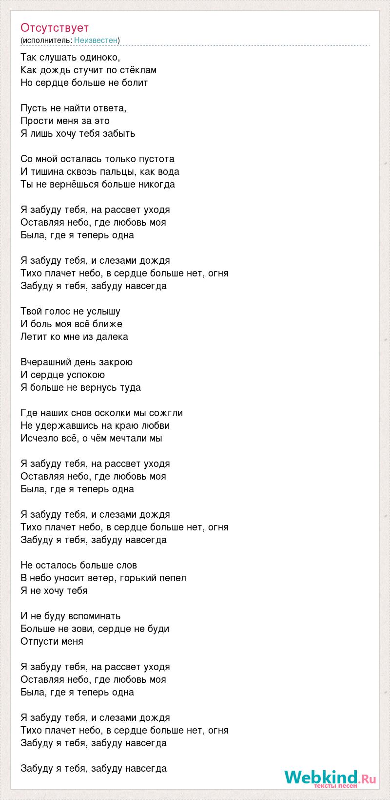 Так слушать одиноко, Как дождь стучит по стёклам Но сердце больше не болит Пусть не найти ответа, Прости меня за это Я лишь хочу тебя забыть Со мной осталась только пустота И тишина сквозь пальцы, как вода Ты не вернёшься больше никогда Я забуду тебя, на рассвет уходя Оставляя небо, где любовь моя Была, где я теперь одна Я забуду тебя, и слезами дождя Тихо плачет небо, в сердце больше нет, огня Забуду я тебя, забуду навсегда Твой голос не услышу И боль моя всё ближе Летит ко мне из далека Вчерашний день закрою И сердце успокою Я больше не вернусь туда Где наших снов осколки мы сожгли Не удержавшись на краю любви Исчезло всё, о чём мечтали мы Я забуду тебя, на рассвет уходя Оставляя небо, где любовь моя Была, где я теперь одна Я забуду тебя, и слезами дождя Тихо плачет небо, в сердце больше нет, огня Забуду я тебя, забуду навсегда Не осталось больше слов В небо уносит ветер, горький пепел Я не хочу тебя И не буду вспоминать Больше не зови, сердце не буди Отпусти меня Я забуду тебя, на рассвет уходя Оставляя небо, где любовь моя Была, где я теперь одна Я забуду тебя, и слезами дождя Тихо плачет небо, в сердце больше нет, огня Забуду я тебя, забуду навсегда Забуду я тебя, забуду навсегда