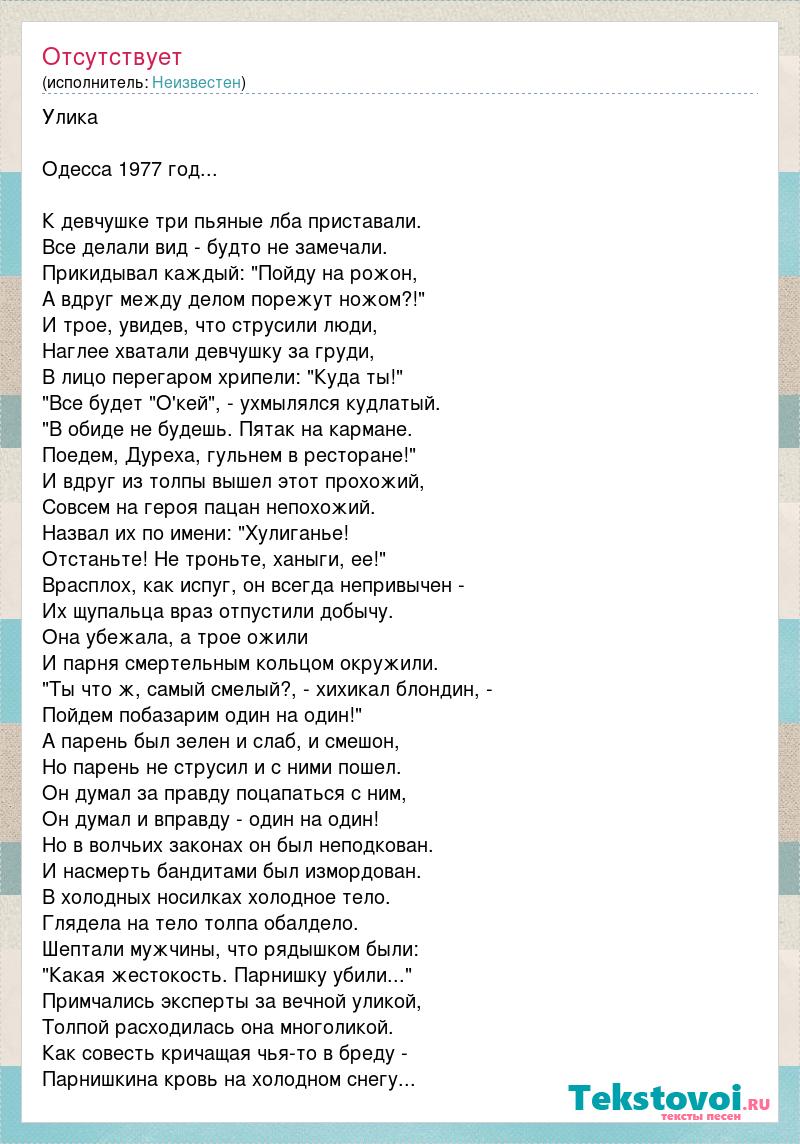 Улика Одесса 1977 год... К девчушке три пьяные лба приставали. Все делали вид - будто не замечали. Прикидывал каждый: "Пойду на рожон, А вдруг между делом порежут ножом?!" И трое, увидев, что струсили люди, Наглее хватали девчушку за груди, В лицо перегаром хрипели: "Куда ты!" "Все будет "О'кей", - ухмылялся кудлатый. "В обиде не будешь. Пятак на кармане. Поедем, Дуреха, гульнем в ресторане!" И вдруг из толпы вышел этот прохожий, Совсем на героя пацан непохожий. Назвал их по имени: "Хулиганье! Отстаньте! Не троньте, ханыги, ее!" Врасплох, как испуг, он всегда непривычен - Их щупальца враз отпустили добычу. Она убежала, а трое ожили И парня смертельным кольцом окружили. "Ты что ж, самый смелый?, - хихикал блондин, - Пойдем побазарим один на один!" А парень был зелен и слаб, и смешон, Но парень не струсил и с ними пошел. Он думал за правду поцапаться с ним, Он думал и вправду - один на один! Но в волчьих законах он был неподкован. И насмерть бандитами был измордован. В холодных носилках холодное тело. Глядела на тело толпа обалдело. Шептали мужчины, что рядышком были: "Какая жестокость. Парнишку убили..." Примчались эксперты за вечной уликой, Толпой расходилась она многоликой. Как совесть кричащая чья-то в бреду - Парнишкина кровь на холодном снегу...