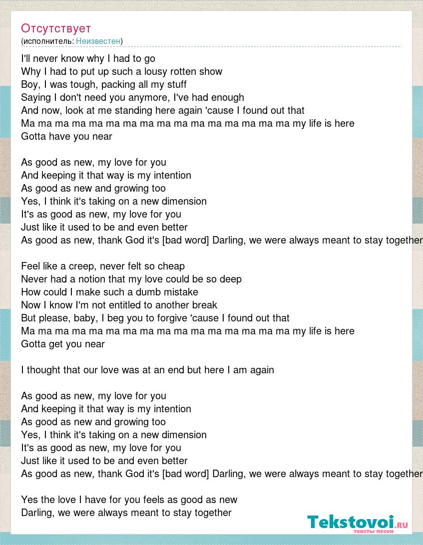 I'll never know why I had to go Why I had to put up such a lousy rotten show Boy, I was tough, packing all my stuff Saying I don't need you anymore, I've had enough And now, look at me standing here again 'cause I found out that Ma ma ma ma ma ma ma ma ma ma ma ma ma ma ma ma my life is here Gotta have you near As good as new, my love for you And keeping it that way is my intention As good as new and growing too Yes, I think it's taking on a new dimension It's as good as new, my love for you Just like it used to be and even better As good as new, thank God it's [bad word] Darling, we were always meant to stay together Feel like a creep, never felt so cheap Never had a notion that my love could be so deep How could I make such a dumb mistake Now I know I'm not entitled to another break But please, baby, I beg you to forgive 'cause I found out that Ma ma ma ma ma ma ma ma ma ma ma ma ma ma ma ma my life is here Gotta get you near I thought that our love was at an end but here I am again As good as new, my love for you And keeping it that way is my intention As good as new and growing too Yes, I think it's taking on a new dimension It's as good as new, my love for you Just like it used to be and even better As good as new, thank God it's [bad word] Darling, we were always meant to stay together Yes the love I have for you feels as good as new Darling, we were always meant to stay together