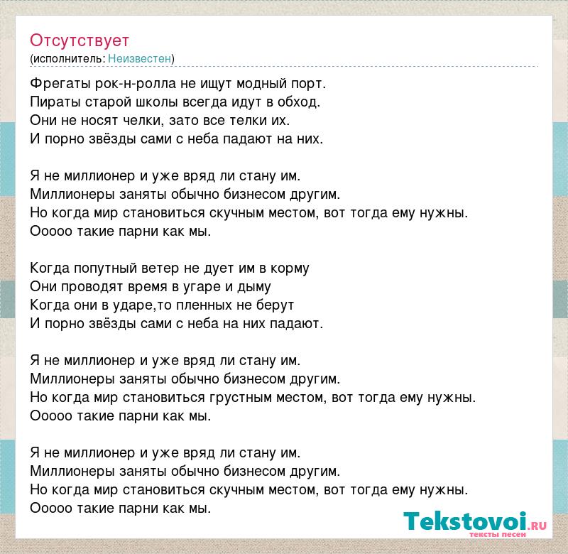 Фрегаты рок-н-ролла не ищут модный порт. Пираты старой школы всегда идут в обход. Они не носят челки, зато все телки их. И порно звёзды сами с неба падают на них. Я не миллионер и уже вряд ли стану им. Миллионеры заняты обычно бизнесом другим. Но когда мир становиться скучным местом, вот тогда ему нужны. Ооооо такие парни как мы. Когда попутный ветер не дует им в корму Они проводят время в угаре и дыму Когда они в ударе,то пленных не берут И порно звёзды сами с неба на них падают. Я не миллионер и уже вряд ли стану им. Миллионеры заняты обычно бизнесом другим. Но когда мир становиться грустным местом, вот тогда ему нужны. Ооооо такие парни как мы. Я не миллионер и уже вряд ли стану им. Миллионеры заняты обычно бизнесом другим. Но когда мир становиться скучным местом, вот тогда ему нужны. Ооооо такие парни как мы.