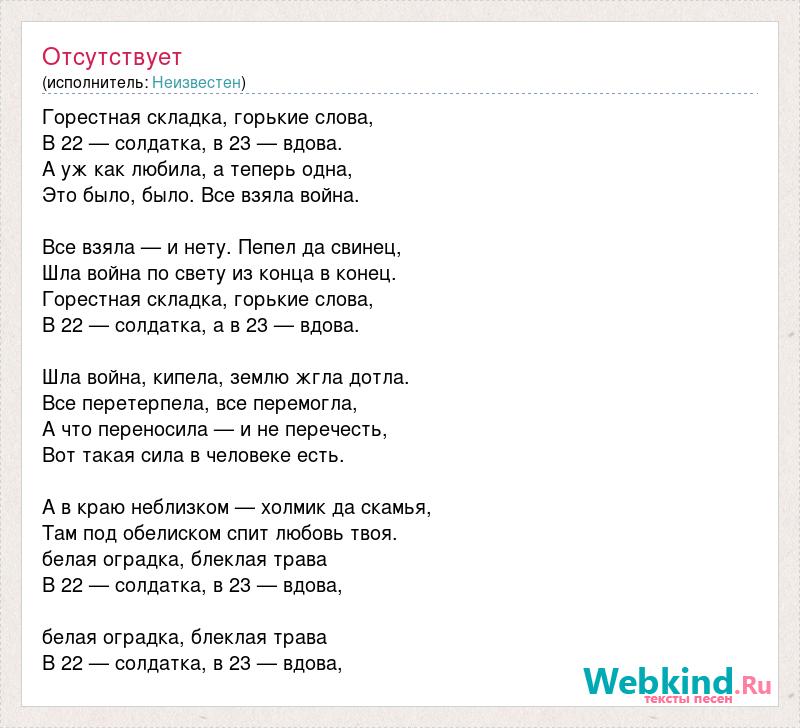 Горестная складка, горькие слова, В 22 — солдатка, в 23 — вдова. А уж как любила, а теперь одна, Это было, было. Все взяла война. Все взяла — и нету. Пепел да свинец, Шла война по свету из конца в конец. Горестная складка, горькие слова, В 22 — солдатка, а в 23 — вдова. Шла война, кипела, землю жгла дотла. Все перетерпела, все перемогла, А что переносила — и не перечесть, Вот такая сила в человеке есть. А в краю неблизком — холмик да скамья, Там под обелиском спит любовь твоя. белая оградка, блеклая трава В 22 — солдатка, в 23 — вдова, белая оградка, блеклая трава В 22 — солдатка, в 23 — вдова,