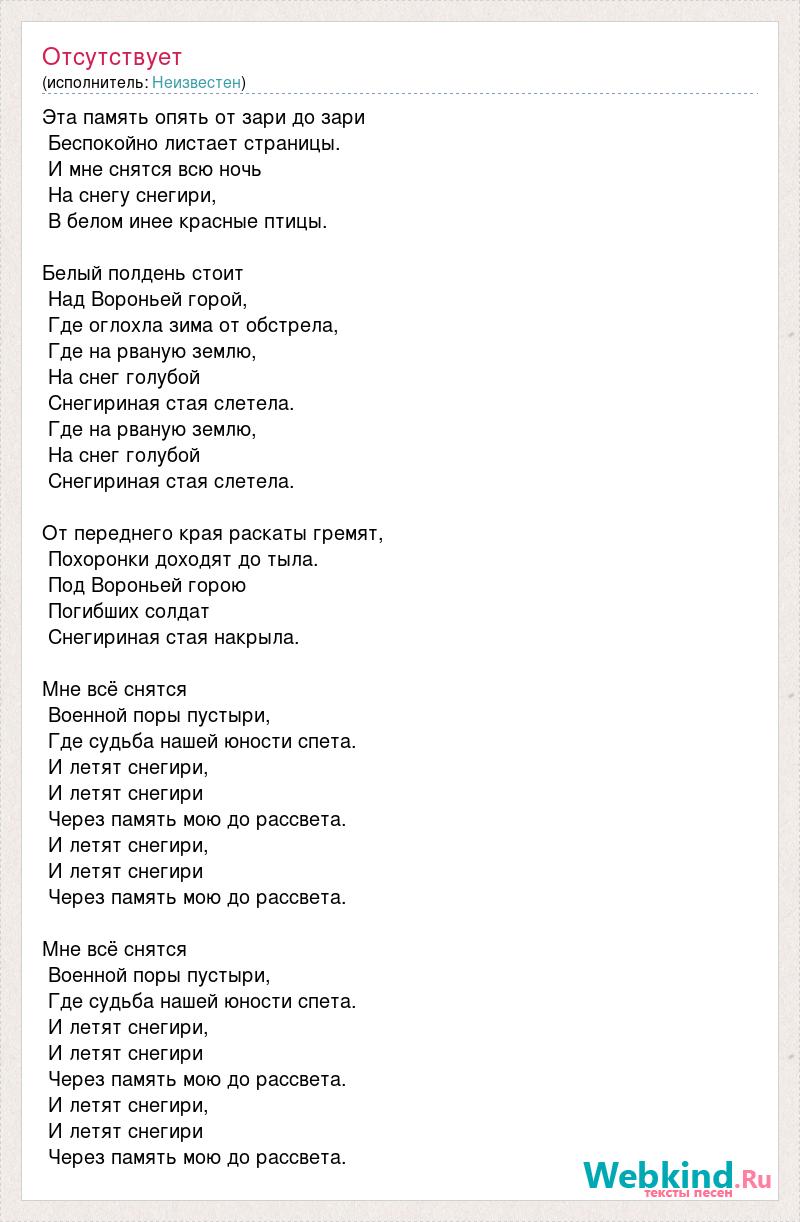 Эта память опять от зари до зари Беспокойно листает страницы. И мне снятся всю ночь На снегу снегири, В белом инее красные птицы. Белый полдень стоит Над Вороньей горой, Где оглохла зима от обстрела, Где на рваную землю, На снег голубой Снегириная стая слетела. Где на рваную землю, На снег голубой Снегириная стая слетела. От переднего края раскаты гремят, Похоронки доходят до тыла. Под Вороньей горою Погибших солдат Снегириная стая накрыла. Мне всё снятся Военной поры пустыри, Где судьба нашей юности спета. И летят снегири, И летят снегири Через память мою до рассвета. И летят снегири, И летят снегири Через память мою до рассвета. Мне всё снятся Военной поры пустыри, Где судьба нашей юности спета. И летят снегири, И летят снегири Через память мою до рассвета. И летят снегири, И летят снегири Через память мою до рассвета.