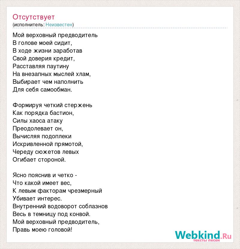 Мой верховный предводитель В голове моей сидит, В ходе жизни заработав Свой доверия кредит, Расставляя паутину На внезапных мыслей хлам, Выбирает чем наполнить Для себя самообман. Формируя четкий стержень Как порядка бастион, Силы хаоса атаку Преодолевает он, Вычисляя подоплеки Искривленной прямотой, Череду сюжетов левых Огибает стороной. Ясно пояснив и четко - Что какой имеет вес, К левым факторам чрезмерный Убивает интерес. Внутренний водоворот соблазнов Весь в темницу под конвой. Мой верховный предводитель, Правь моею головой!
