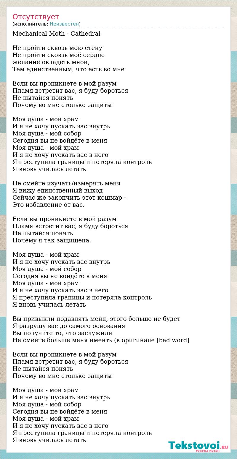 Mechanical Moth - Cathedral Не пройти сквозь мою стену Не пройти сковзь моё сердце желание овладеть мной, Тем единственным, что есть во мне Если вы проникнете в мой разум Пламя встретит вас, я буду бороться Не пытайся понять Почему во мне столько защиты Моя душа - мой храм И я не хочу пускать вас внутрь Моя душа - мой собор Сегодня вы не войдёте в меня Моя душа - мой храм И я не хочу пускать вас в него Я преступила границы и потеряла контроль Я вновь училась летать Не смейте изучать/измерять меня Я вижу единственный выход Сейчас же закончить этот кошмар - Это избавление от вас. Если вы проникнете в мой разум Пламя встретит вас, я буду бороться Не пытайся понять Почему я так защищена. Моя душа - мой храм И я не хочу пускать вас внутрь Моя душа - мой собор Сегодня вы не войдёте в меня Моя душа - мой храм И я не хочу пускать вас в него Я преступила границы и потеряла контроль Я вновь училась летать Вы привыкли подавлять меня, этого больше не будет Я разрушу вас до самого основания Вы получите то, что заслужили Не смейте больше меня именть (в оригинале [bad word] Если вы проникнете в мой разум Пламя встретит вас, я буду бороться Не пытайся понять Почему во мне столько защиты Моя душа - мой храм И я не хочу пускать вас внутрь Моя душа - мой собор Сегодня вы не войдёте в меня Моя душа - мой храм И я не хочу пускать вас в него Я преступила границы и потеряла контроль Я вновь училась летать