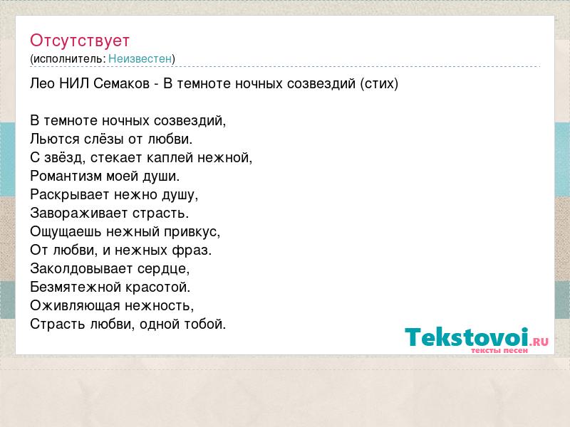 Лео НИЛ Семаков - В темноте ночных созвездий (стих) В темноте ночных созвездий, Льются слёзы от любви. С звёзд, стекает каплей нежной, Романтизм моей души. Раскрывает нежно душу, Завораживает страсть. Ощущаешь нежный привкус, От любви, и нежных фраз. Заколдовывает сердце, Безмятежной красотой. Оживляющая нежность, Страсть любви, одной тобой.