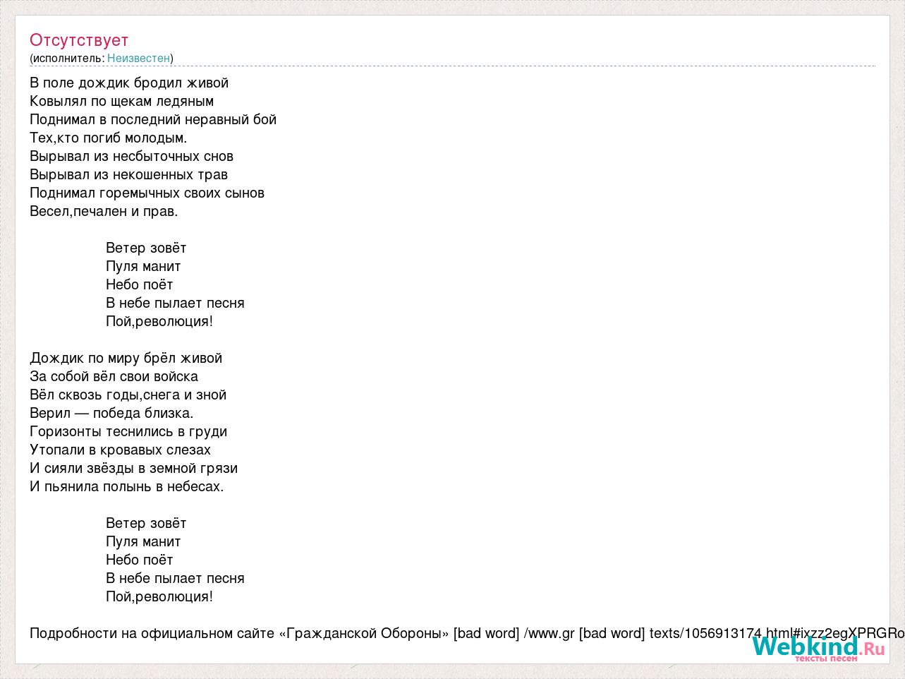 В поле дождик бродил живой Ковылял по щекам ледяным Поднимал в последний неравный бой Тех,кто погиб молодым. Вырывал из несбыточных снов Вырывал из некошенных трав Поднимал горемычных своих сынов Весел,печален и прав. Ветер зовёт Пуля манит Небо поёт В небе пылает песня Пой,революция! Дождик по миру брёл живой За собой вёл свои войска Вёл сквозь годы,снега и зной Верил — победа близка. Горизонты теснились в груди Утопали в кровавых слезах И сияли звёзды в земной грязи И пьянила полынь в небесах. Ветер зовёт Пуля манит Небо поёт В небе пылает песня Пой,революция! Подробности на официальном сайте «Гражданской Обороны» [bad word] /www.gr [bad word] texts/1056913174.html#ixzz2egXPRGRo