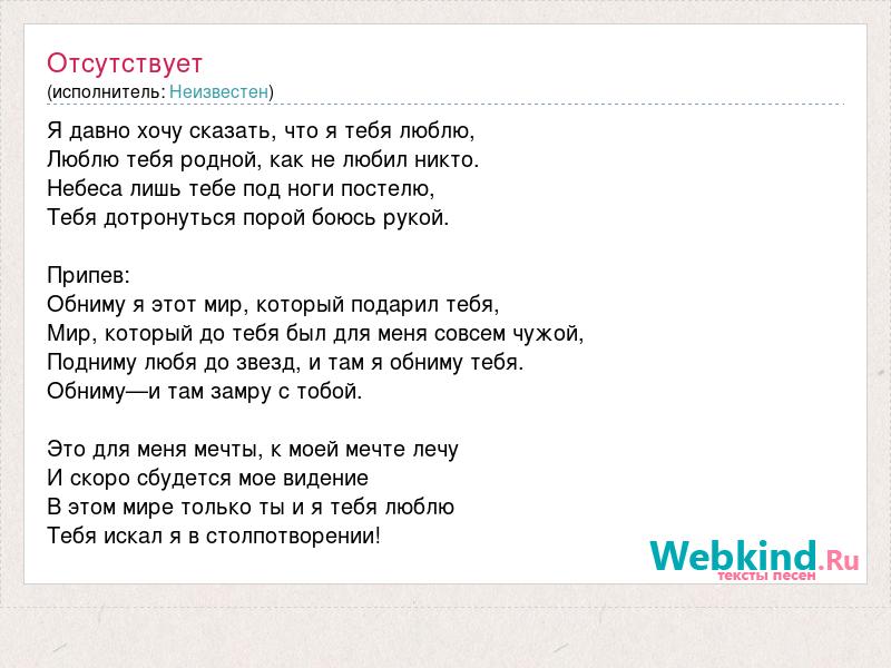Я давно хочу сказать, что я тебя люблю, Люблю тебя родной, как не любил никто. Небеса лишь тебе под ноги постелю, Тебя дотронуться порой боюсь рукой. Припев: Обниму я этот мир, который подарил тебя, Мир, который до тебя был для меня совсем чужой, Подниму любя до звезд, и там я обниму тебя. Обниму—и там замру с тобой. Это для меня мечты, к моей мечте лечу И скоро сбудется мое видение В этом мире только ты и я тебя люблю Тебя искал я в столпотворении!