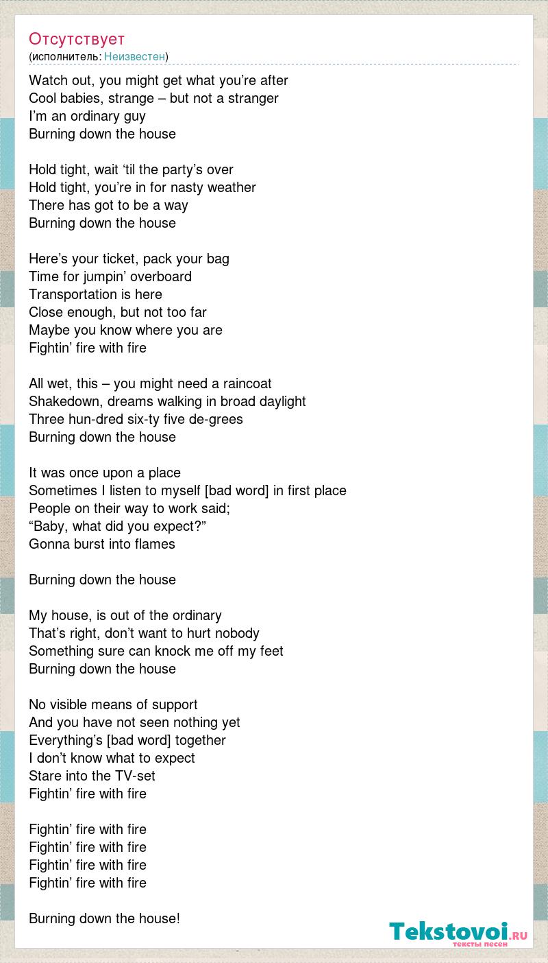 Watch out, you might get what you’re after Cool babies, strange – but not a stranger I’m an ordinary guy Burning down the house Hold tight, wait ‘til the party’s over Hold tight, you’re in for nasty weather There has got to be a way Burning down the house Here’s your ticket, pack your bag Time for jumpin’ overboard Transportation is here Close enough, but not too far Maybe you know where you are Fightin’ fire with fire All wet, this – you might need a raincoat Shakedown, dreams walking in broad daylight Three hun-dred six-ty five de-grees Burning down the house It was once upon a place Sometimes I listen to myself [bad word] in first place People on their way to work said; “Baby, what did you expect?” Gonna burst into flames Burning down the house My house, is out of the ordinary That’s right, don’t want to hurt nobody Something sure can knock me off my feet Burning down the house No visible means of support And you have not seen nothing yet Everything’s [bad word] together I don’t know what to expect Stare into the TV-set Fightin’ fire with fire Fightin’ fire with fire Fightin’ fire with fire Fightin’ fire with fire Fightin’ fire with fire Burning down the house!